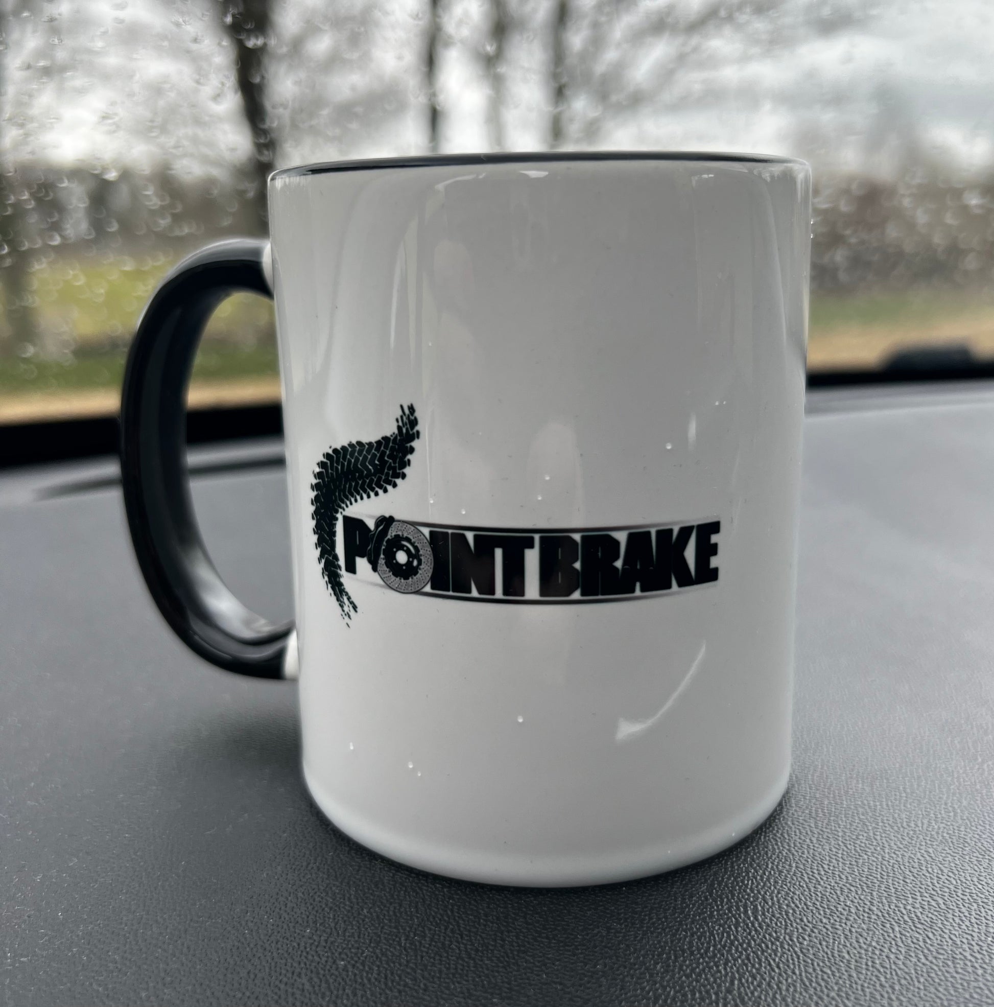 330ml Ceramic Mug. Black inside with black handle. Full logo on both sides of the mug.